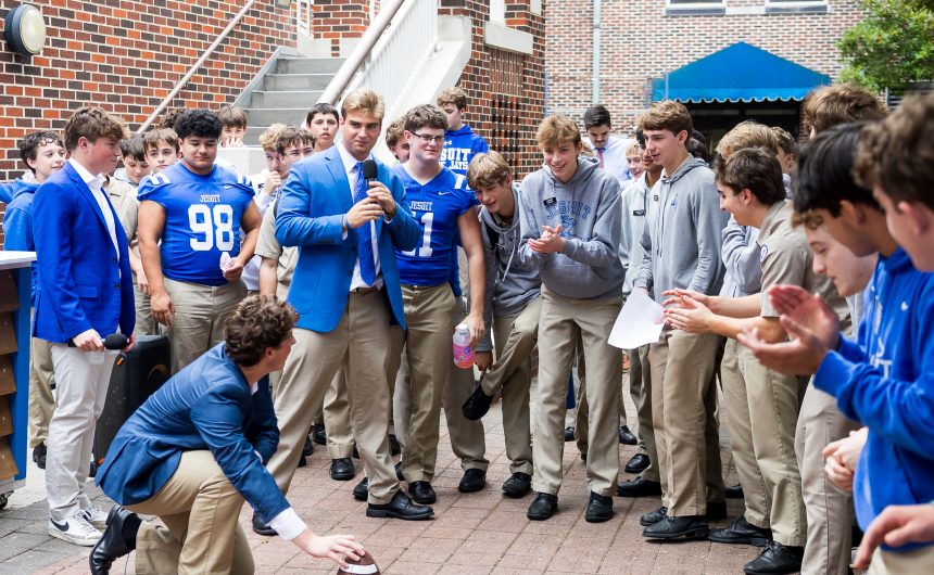 Blue Jays rally in Traditions Courtyard ahead of Friday night’s matchup for Gizzard Gameday, broadcast from a handmade sports desk crafted by senior Cole Puneky and hosted by Spencer Waguespack ’25. Lunchtime hype peaked as senior Zach Lagraize lined up and drilled a field goal during student activities.