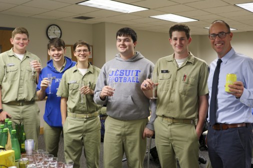 The Sparkling Water Society’s E-Board, William Shropshire, Bo Bell, Andrew Gruntz, Andrew Bechtel, Gabe Dupuy, and Mr. Smith raise a fizzy toast to the carbonated water of which they are so fond. The Jesuit Sparkling Water Society (S.W.S) was born from curiosity about Mr. Smith’s love of sparkling mineral water and was created to spread the appreciation for the finer things in life. The society was founded on these four principles: hydration (water is key), common sense (water and carbon are the foundations of life), elitism (sparkling water is far superior to regular water), and health (good alternative to sugary sodas). This day marked their second meeting as a group and boasted more than 20 students – a few of whom had never had the pleasure of sipping seltzer. The S.W.S served up a variety of H2O with big names like S. Pellegrino and lemon La Croix, and lesser-known bubblies like H.E.B variety, lemon-lime Central Market, and lemon Bubly. Some newcomers were enthusiastic about the fizzy water they sampled while others left unimpressed. But, Mr. Smith encouraged the soda water doubters saying, “Like most of the finer things in life, you have to acquire a taste for it.”