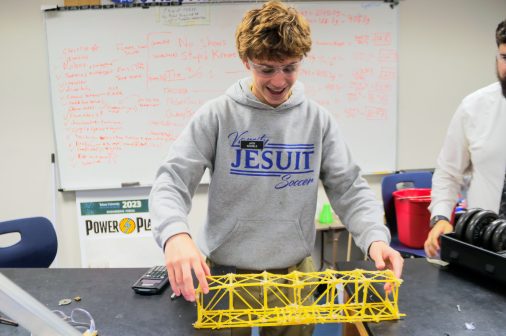 Students in Dr. Wayne Wagner’s ’16 physics class were tasked with constructing “spaghetti bridges” in order to better understand how structures resist specific forces. Junior Jack Kessels sets up his bridge across the gap as Mr. Travis Kieff ’17 gets ready to load the bridge with weights. In increasing increments, weights are added to test the structural integrity of the bridge until the weight is too much to bear. Snap!