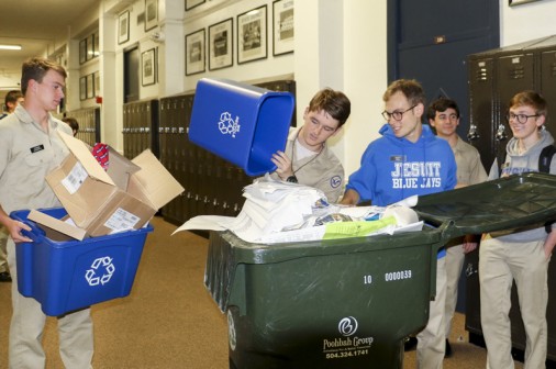 Environmental stewards of campus, seniors Conor Shwartz, William Braham, and Dusty Doll, took to the halls to tackle the overflowing bins of recyclable material. Students in the Green Club and the National Honor Society volunteer each Thursday afternoon to empty the hallway bins. Green Club members also participate in activities that include going on field trips, gardening, recycling, and hosting guest lecturers.