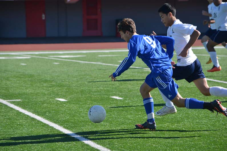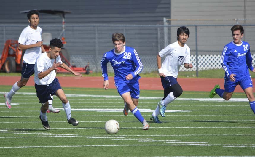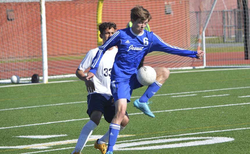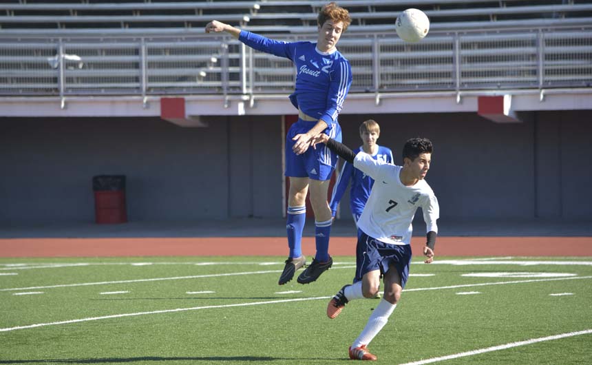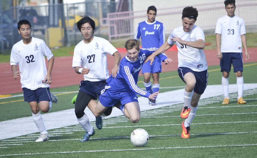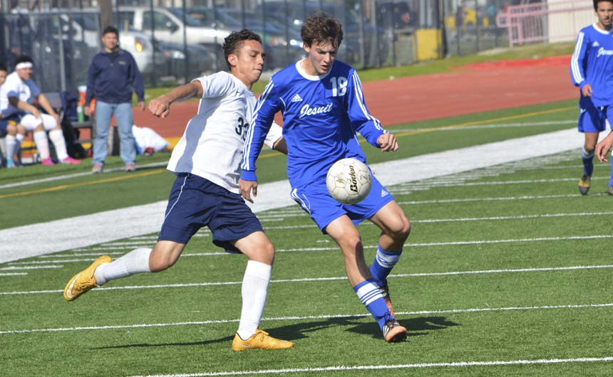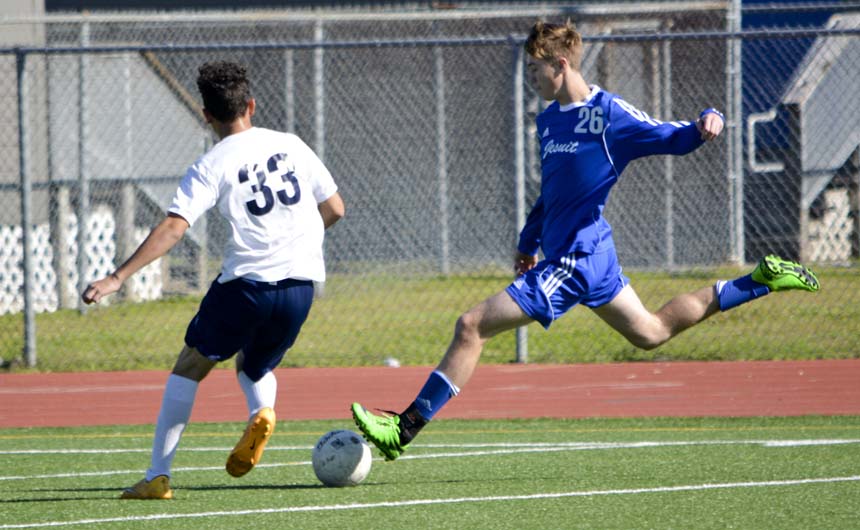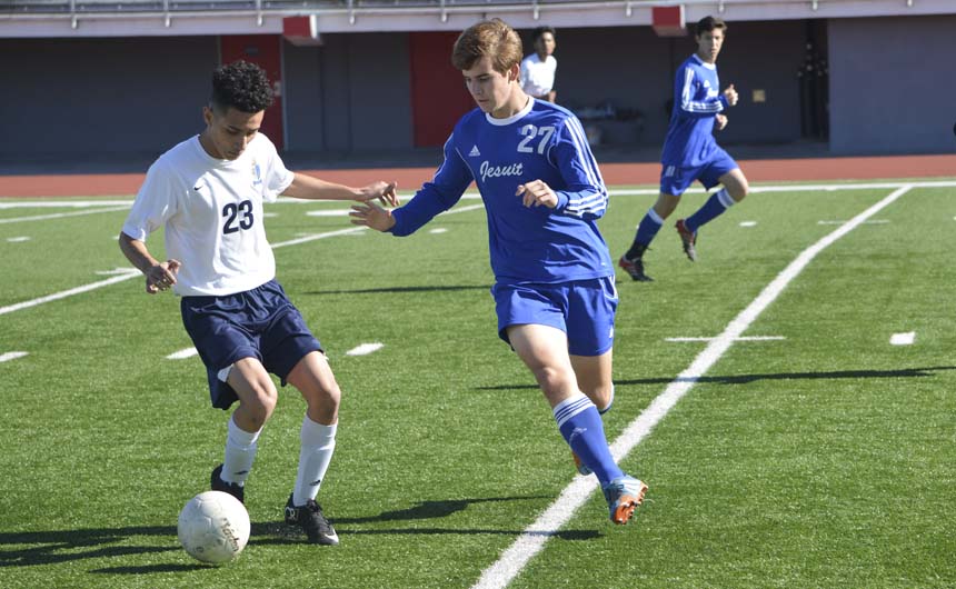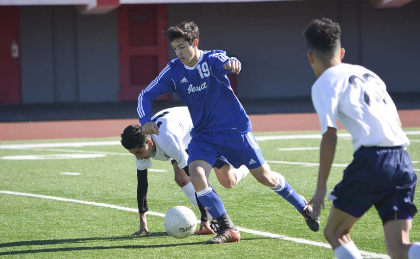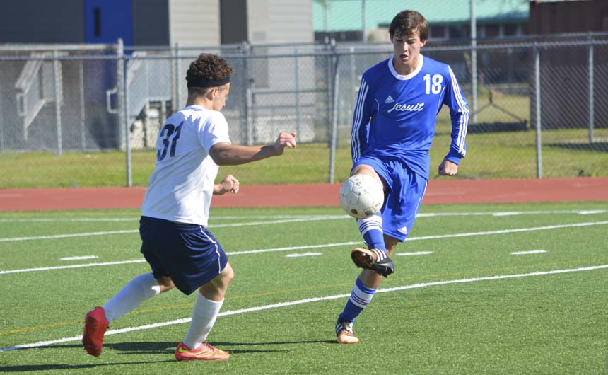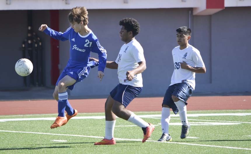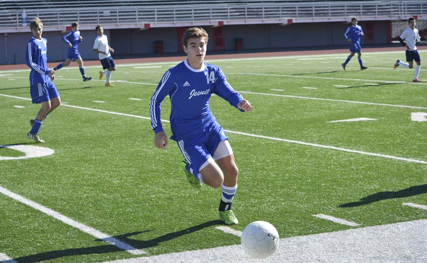 Junior Vincent Baumer snags a ball with his foot during Jesuit’s 5-0 win over L.W. Higgins on Jan. 16.