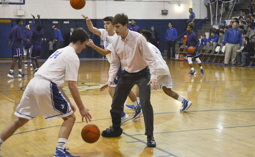 The Jays' leading scorer and rebounder, senior Rob Weiss, gets involved in pre-game warm-ups, walking boot and all. -