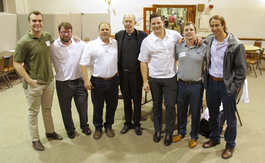 Grant Leger ’11, 2015-16 LEF chairman Marc Bonifacic ’92, 2014-15 LEF chair Mike Varisco ’83, Fr. Anthony McGinn, S.J. ’66, Luke Voiron ’11, Mike Firmin ’11, and Jay Napolitano ’11 celebrate a successful evening of connecting with classmates in St. Ignatius Hall.