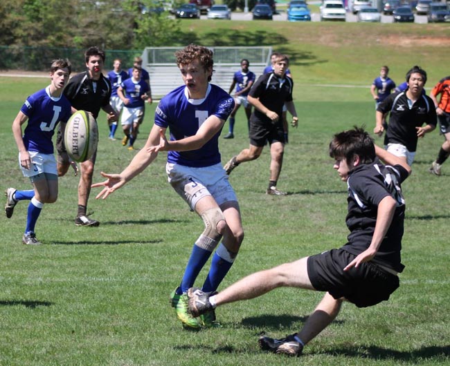 Junior Jacob Whitlow off-loads a nice lateral. Sophomore Matthew Palmer is in the background. -