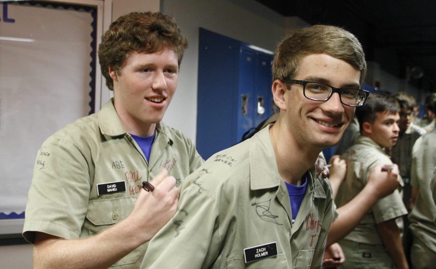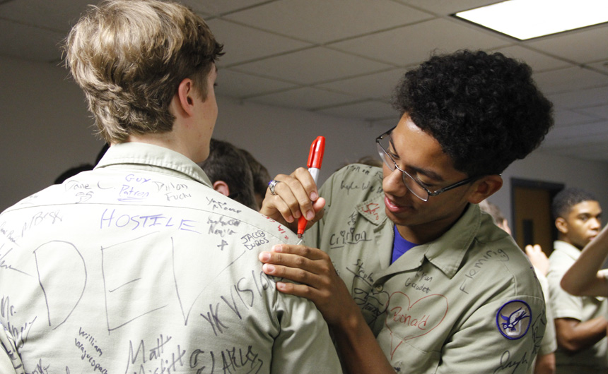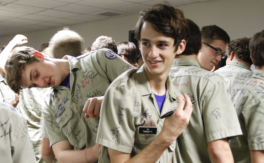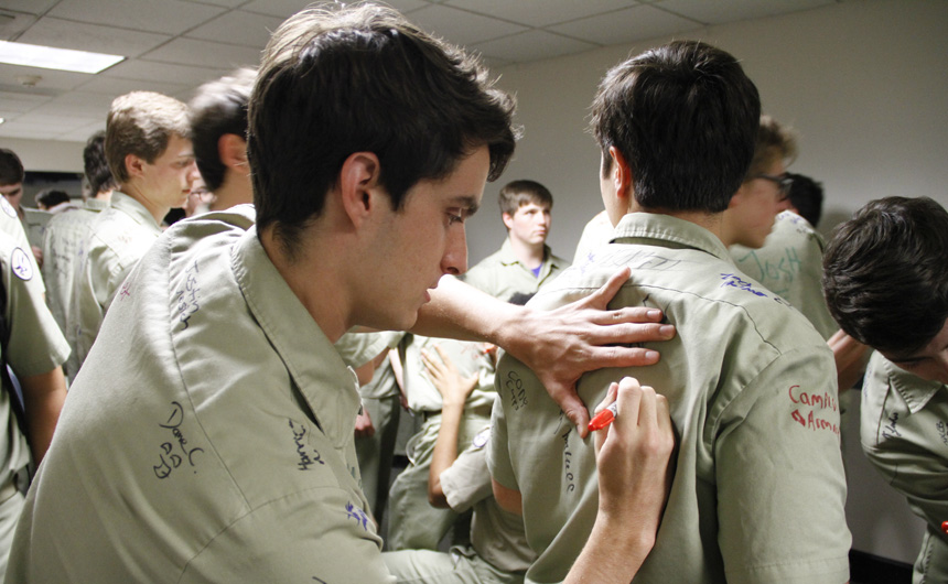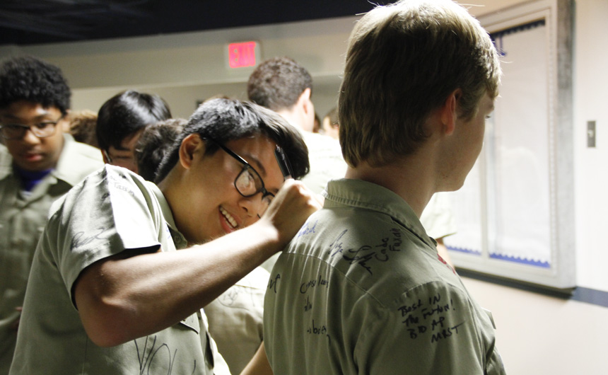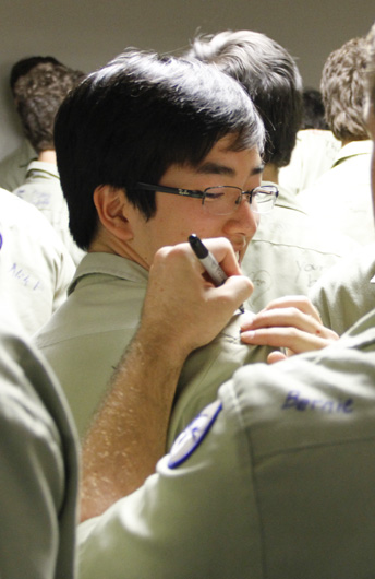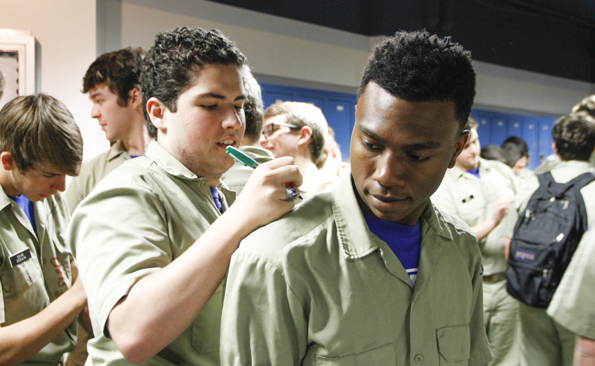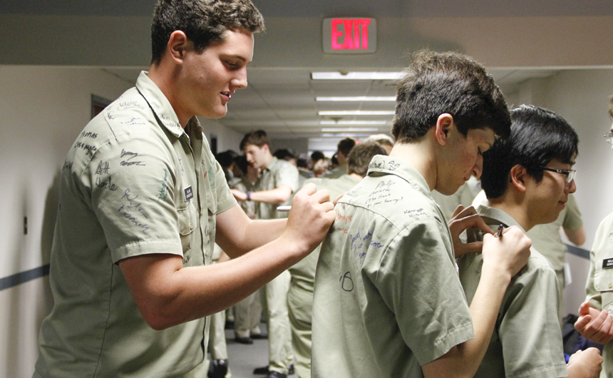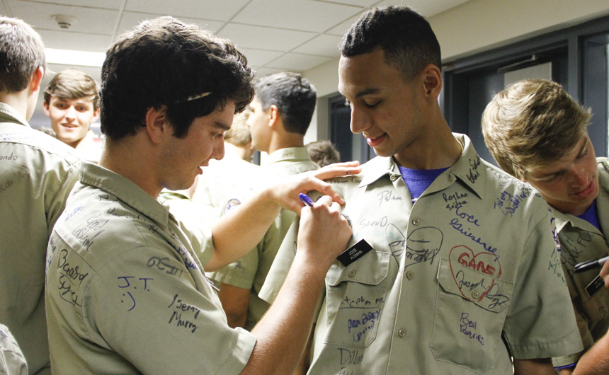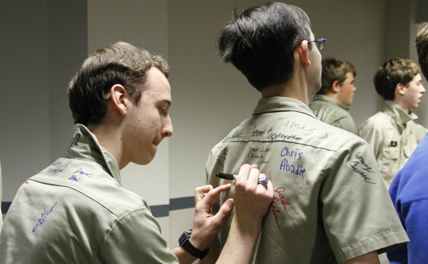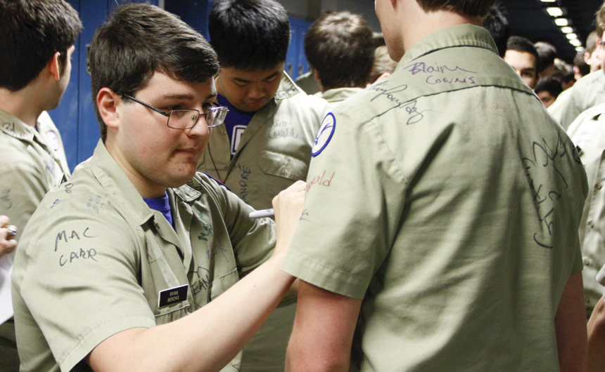 Prefect of Discipline Top Abshire finds his standard spot to add his signature to Andre Nguyen's shirt -- underneath the collar.