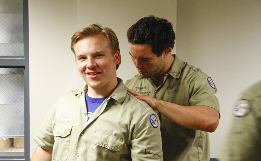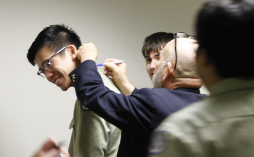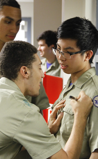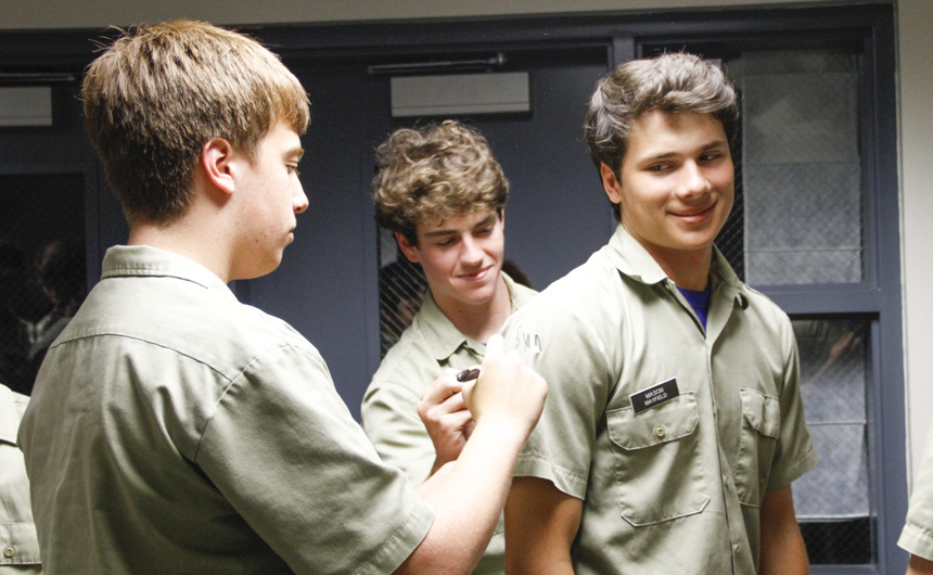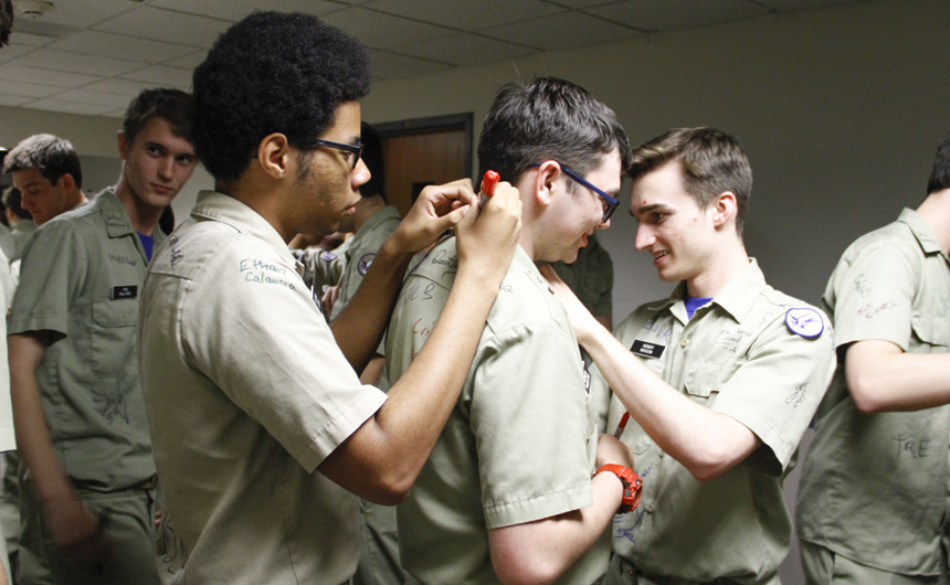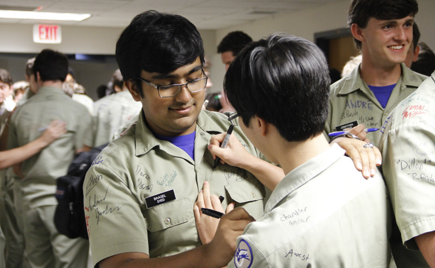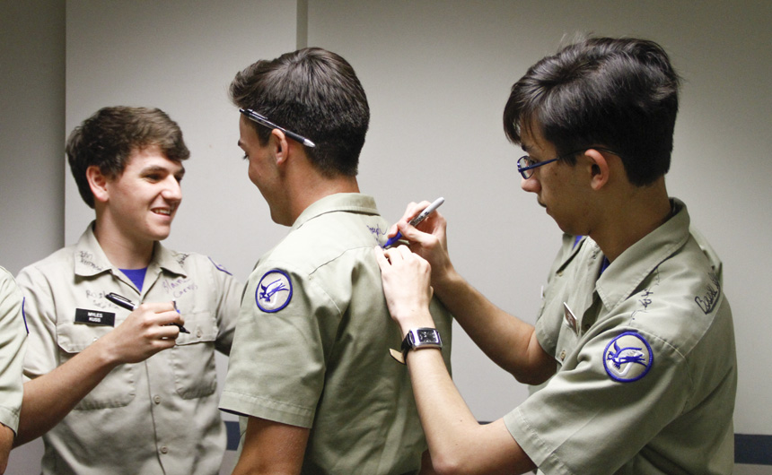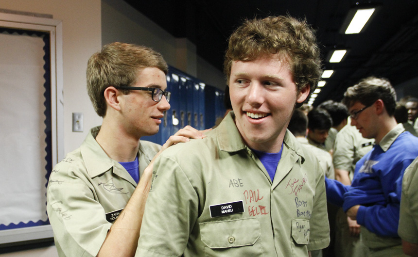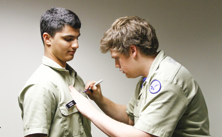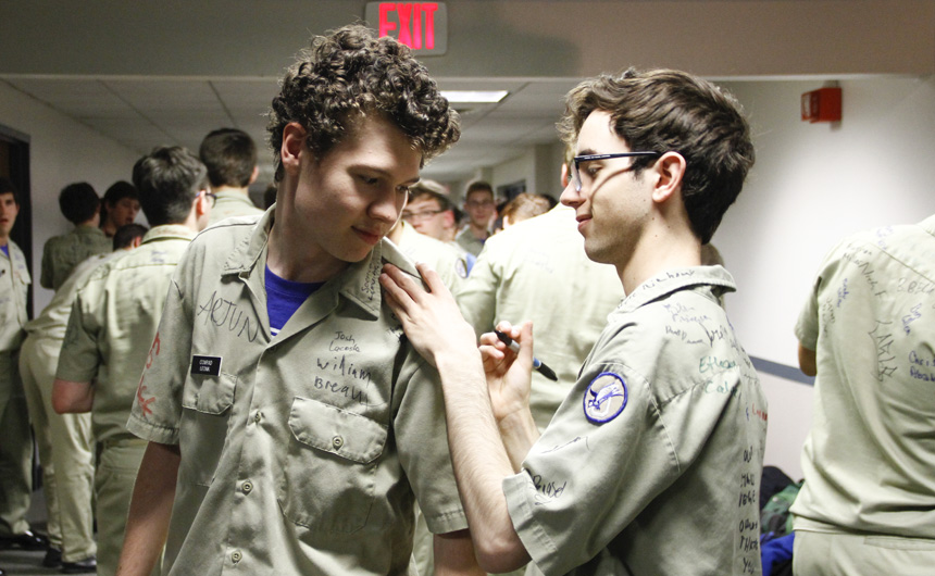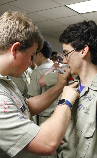 Prefect of Discipline Top Abshire finds his standard spot to add his signature to Andre Nguyen's shirt -- underneath the collar.