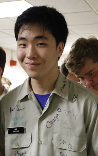 Jae Kweon waits as classmates sign his shirt. -