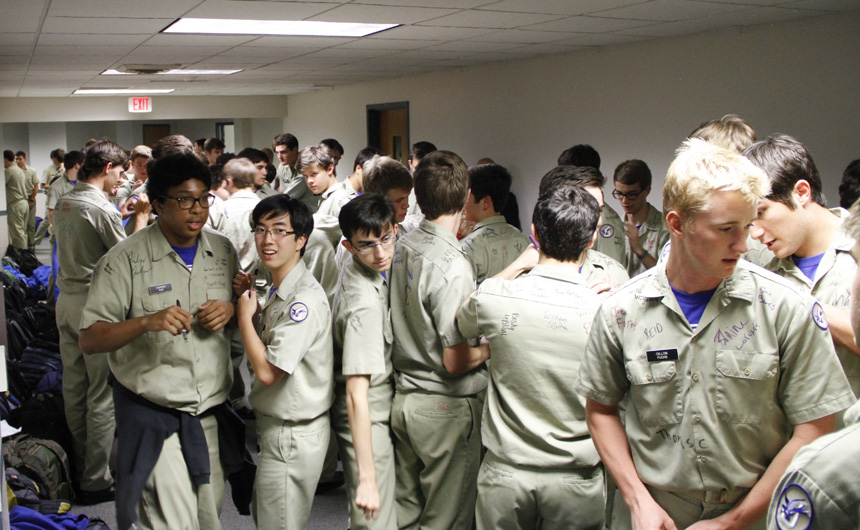 The Class of 2016 assembled at lunch to continue a tradition on the last day of classes for seniors — the signing of uniform shirts. Originally scheduled to take place on Will Clark Field, the shirt signing was moved indoors due to inclement weather. (Thunderstorms also prompted the cancellation of yesterday’s Slip & Slide lunch activity.)