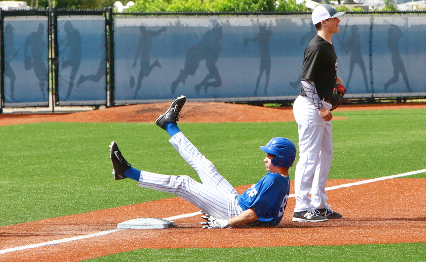 Mack Miller slides into third base, a bit ungracefully, but who cares since he pounded a triple to right center field in Retif’s games against Lakeshore.