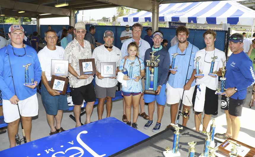 Some of the first place winners of Jesuit’s 24th Fishing Rodeo are, from left: Peyton Cox ’17 (Redfish, Division 2); Jamie Bonck (Sheepshead); Ray Faugeaux ’73 (Red Snapper, Division 1); Lenny Labiche (Speckled Trout, Division 1); Olivia & David Lavie ’84 (Father & Daughter); Damon DiMarco (Five-Trout Stringer); Zack Robert ’16 (Red Snapper, Division 2); Blake Dulcich ’17 (Flounder, Speckled Trout, Division 2); and George Haydel (Biggest Fish).