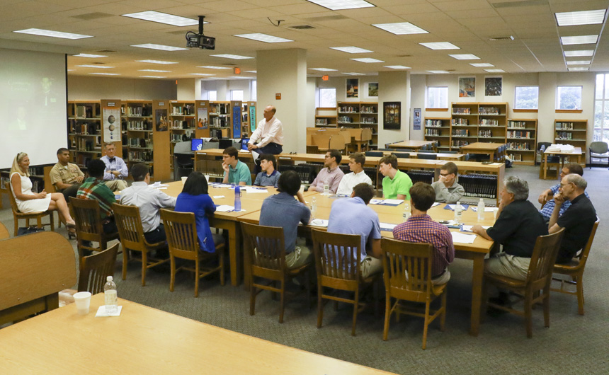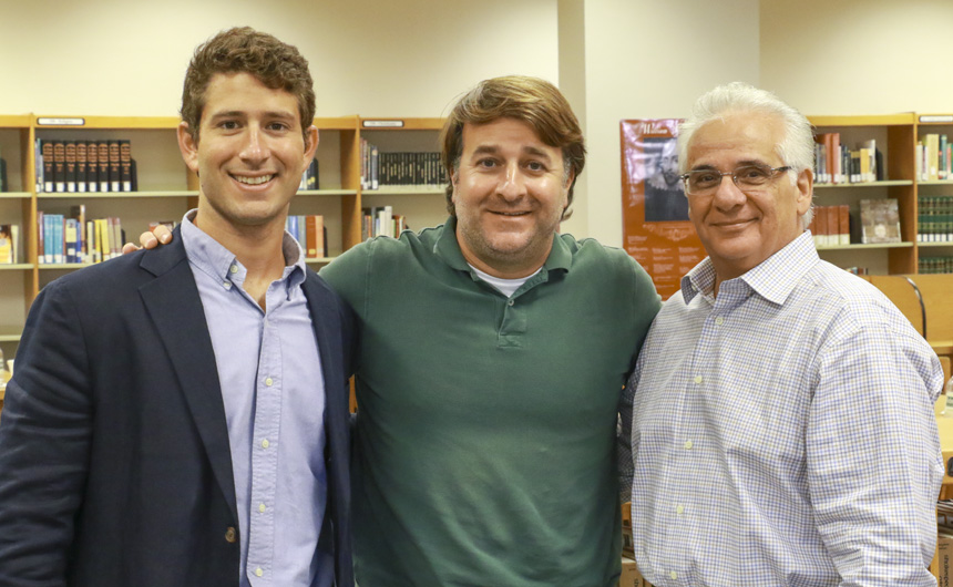 Alumni (from left) Matt Robert '12, Brian Gibbs '90, and Bubby Valentino '65 joined the team to relate lessons in leadership that they learned during their time as students. -