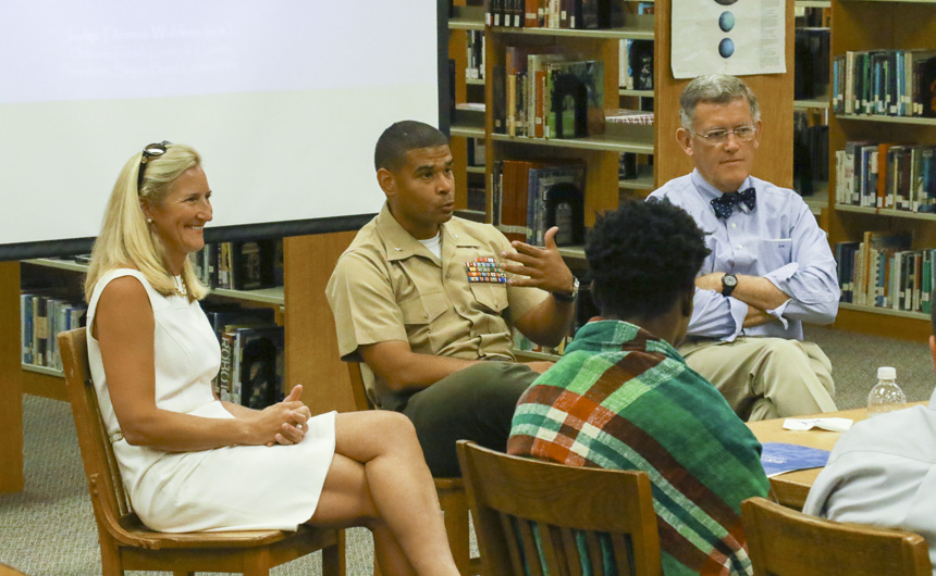 Special afternoon guests (from left) Judge Dennis Waldron, Dr. Jennifer Couvillon, and Lt. Col. Brandon Gregoire '91 -