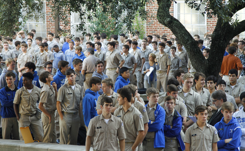 Clear skies on Monday morning afforded Blue Jays the opportunity to participate in the time-honored tradition of Morning Assembly. Students from all grade levels lined up in their new positions for the 2016-2017 school year. Mr. Peter Kernion ’90, the principal of Jesuit High School, encouraged students to do all things for the greater glory of God by borrowing from the motto of the Olympics – Citius, Altius, Fortius or “Faster, Higher, Stronger.”
