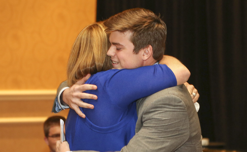 Davis Martin embraces his mother, Missy, after his words of gratitude about his mother’s role in his life.