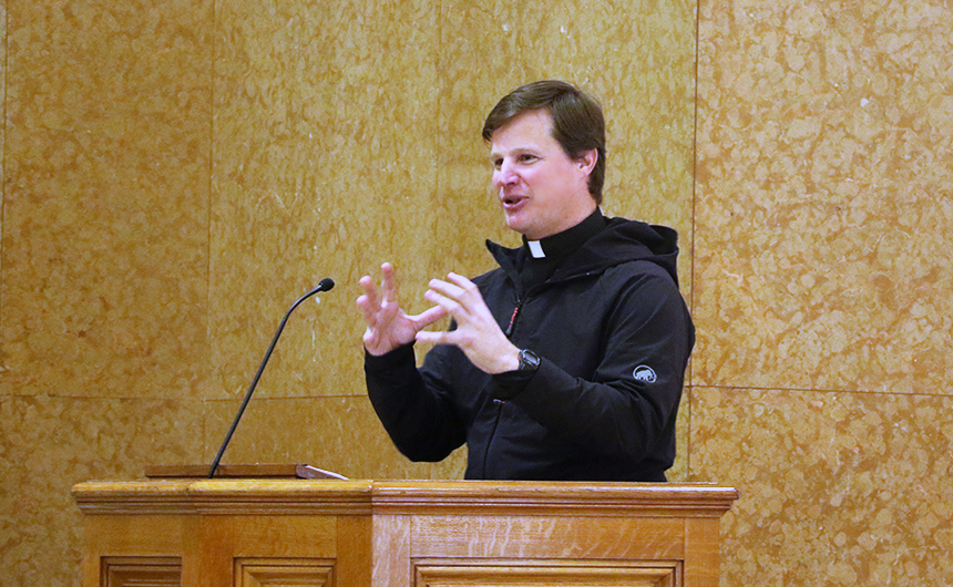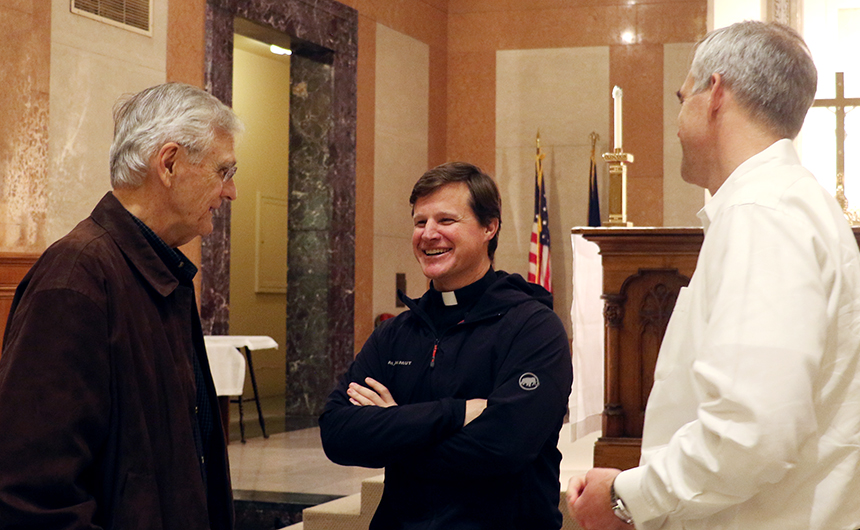 Fr. Randy Gibbens, S.J. ’95 (foreground) prepares to give his talk to alumni in the Chapel of the North American Martyrs.