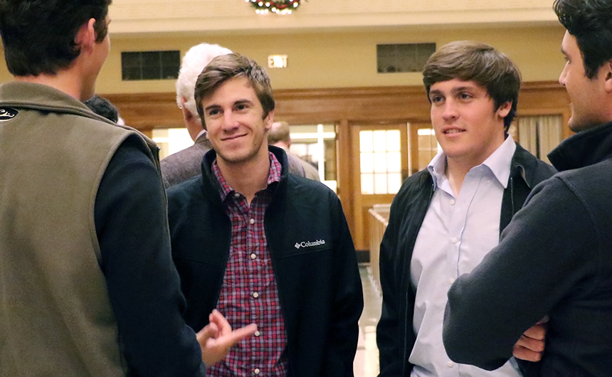 Member of the Class of 2015 catch up before the presentation: (from left) Michael McMahon, Daniel Augustin, Daniel Edmund, and Logan Hornung. -