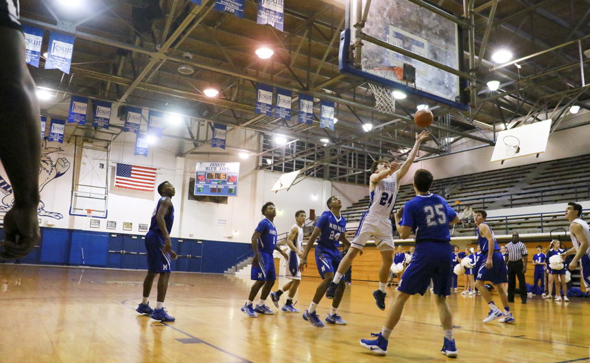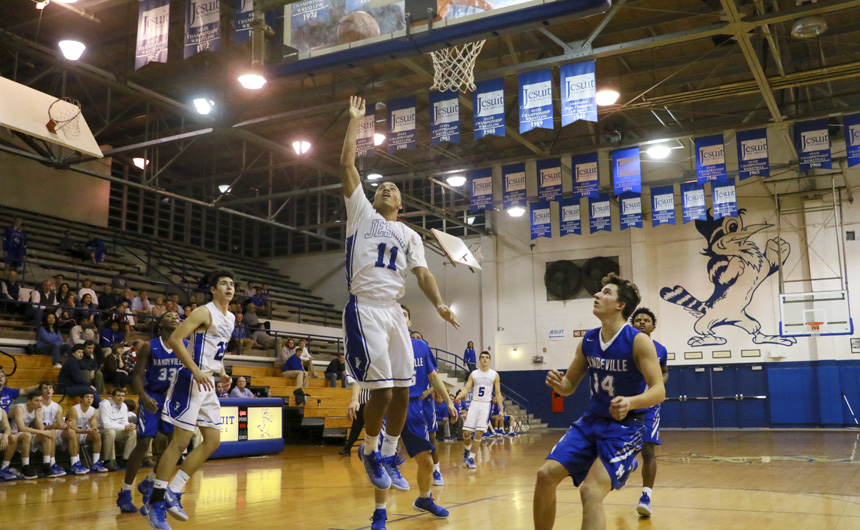 Elijah Morgan also had a triple three pointer night, this one from the wing near the Jesuit bench. -