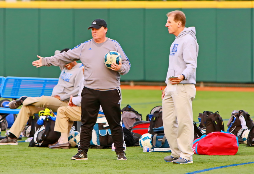 Coach Hubie Collins (left) talks strategy with assistant coach Dave Storm in Thursday’s match against Higgins at John Ryan Stadium. “Maybe the same tale from Tuesday night, we started the game brightly, created opportunities, took us awhile, but once we got the first couple of goals, we were able to build some confidence and grow on that,” said Coach Collins after the match.