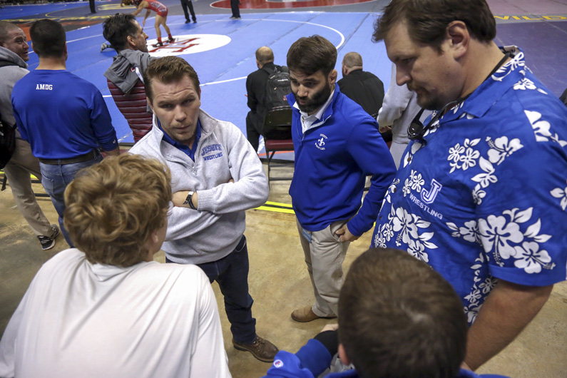 Coaches gather for a chat with their wrestlers to talk through the tournament strategy. -