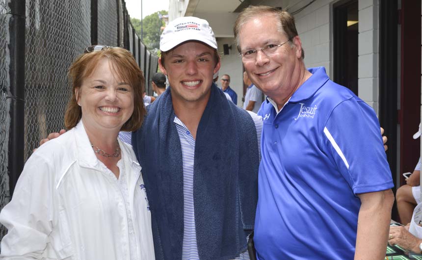 Jesuit’s top singles player, freshman Jojo Sandoz, managed to rehab a significant ankle sprain incurred in a freak accident at regional competition in time to compete. Sandoz, who was still wearing a walking boot as recently as Monday after stepping on a ball in a regional semifinal match, got final clearance from his physical therapist on the afternoon before the tournament. Heavily taped and still clearly hurting, Sandoz gutted out a first round win over an opponent from Hahnville before bowing out to Catholic’s Nick Watson, the eventual singles champion.