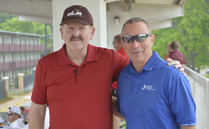 Monroe resident Glen Scioneaux '72 talks with athletic director Dave Moreau. Scioneaux, a retired state employee, shows up at every state tournament to root for the Jays. -