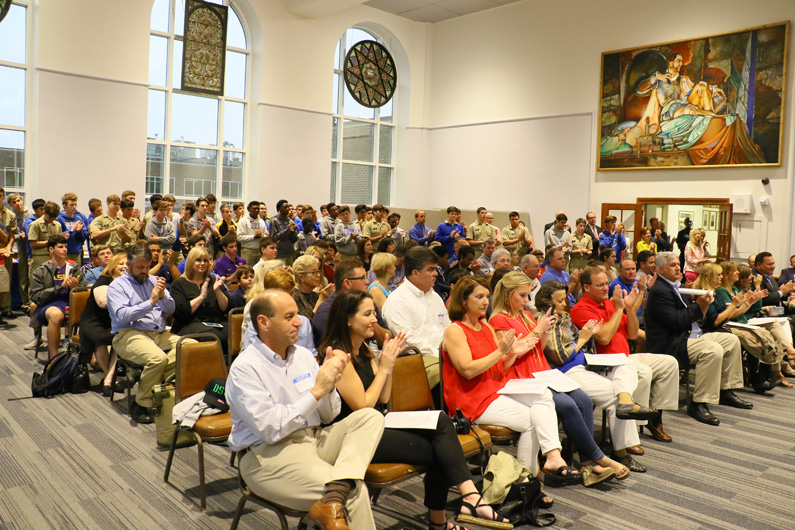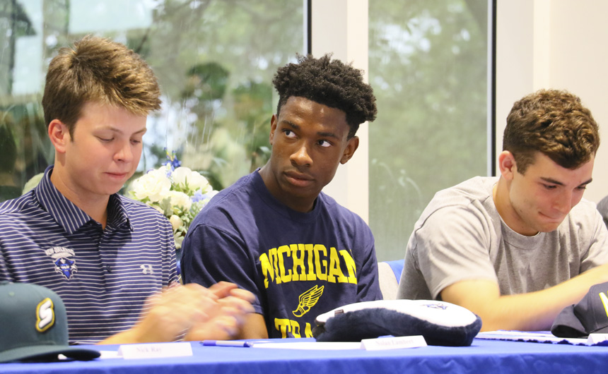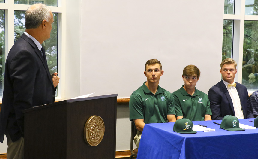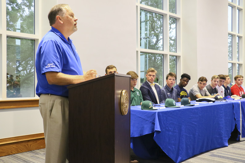 “Today is a wonderful day for these fifteen Blue Jays who are finalizing their commitments to play on an NCAA athletic team,” said Jesuit athletic director Dave Moreau, who introduced each of the athletes and their coaches to the lunchtime crowd in St. Ignatius Hall. “To be at this point where you are today, you have God-given talent and skills and you’ve received sound guidance and tutelage from your parents, family, coaches, and teachers. You brought drive, effort, competitiveness, and a teachable spirit in developing not only skills, but also a set of standards and values.”