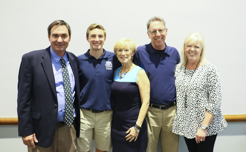 Noah Wilkins with head swimming coach Bret Hanemann '85, his parents, Kay and Lee, and Jan Labure -
