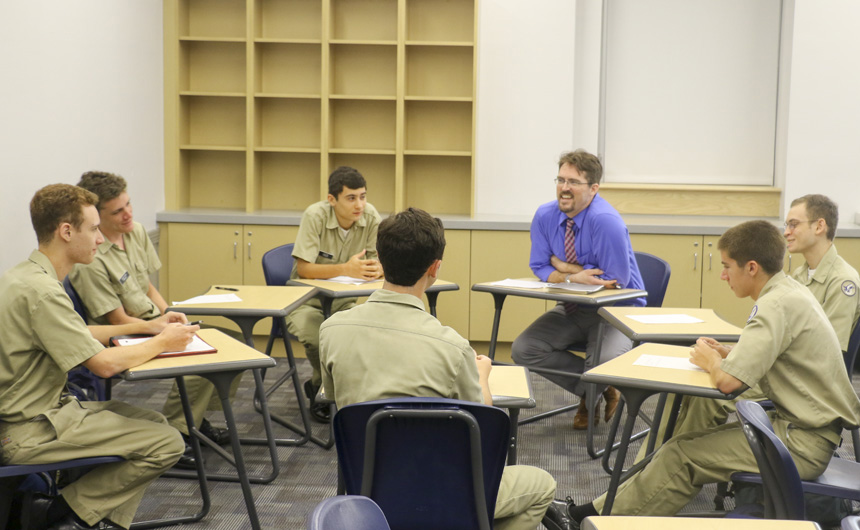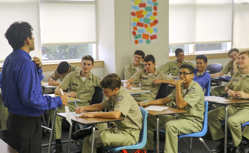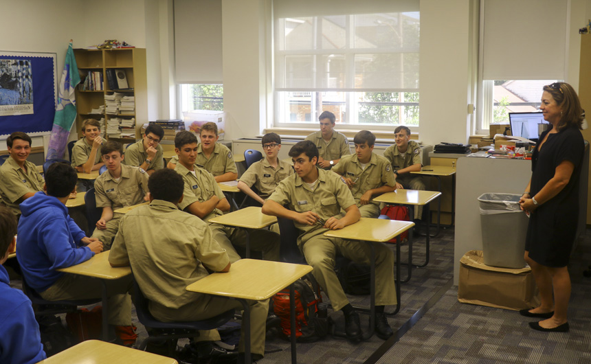 Alumni Service Corps member Mr. Zac Creel '13 walks the rows of his pre-freshman homeroom. -