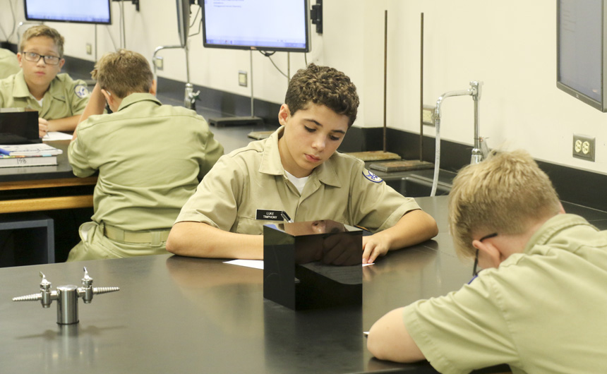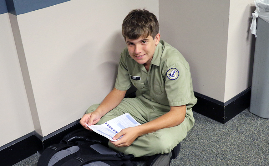 Pre-freshman Luke Timphony takes a pre-test in Coach Moran's physical science class. -
