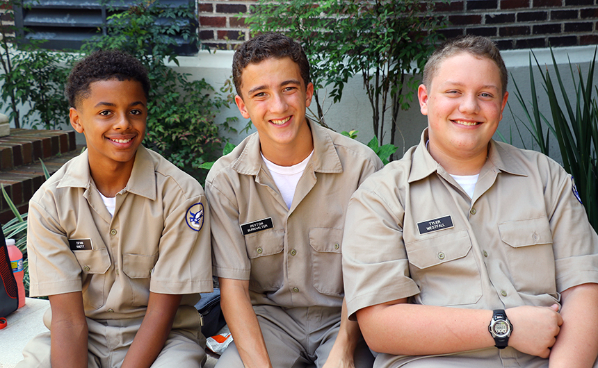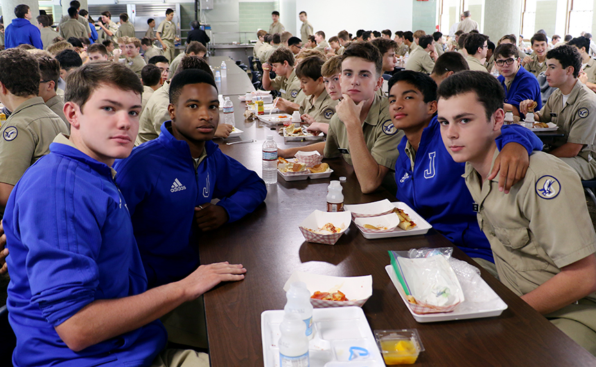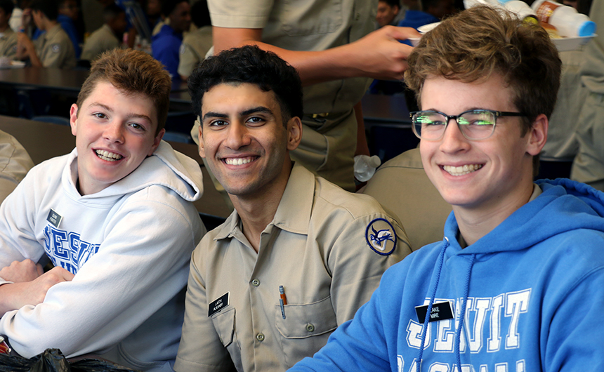 Pre-freshmen Luke Giroir, Joseph Finger, and Nate Jackson enjoy their first lunch at Jesuit. -