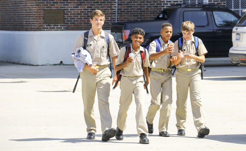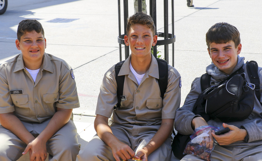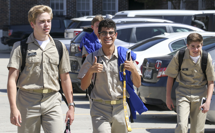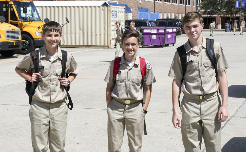 With one full day in khaki under their belt, pre-freshmen Andrew Cavignac, Luke Barbara, and Jake Compton head to the carpool line. -