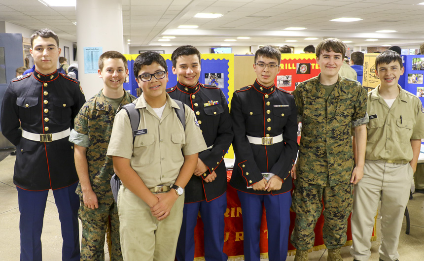 Members of the MCJROTC and drill team welcome Joaquin Enamorado -