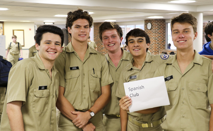 Evan Green, Andrew Burnside, Patrick Calhoun, Jordan Tufts, and Andrew Ryan gathered in front of the Spanish Club table to share their experiences in the club. -