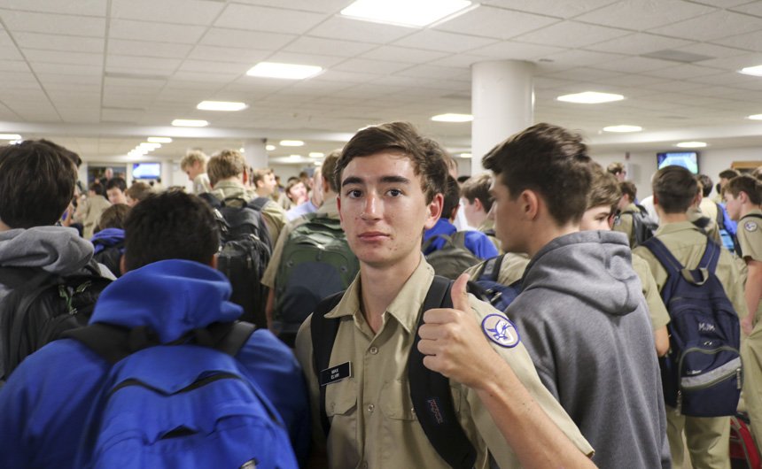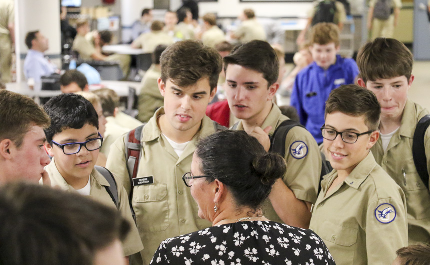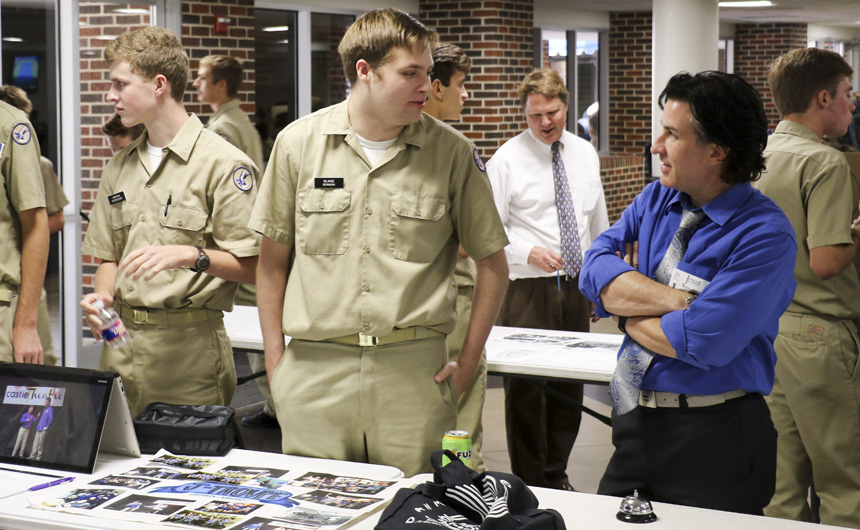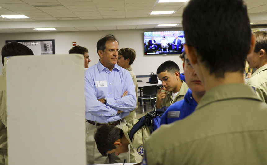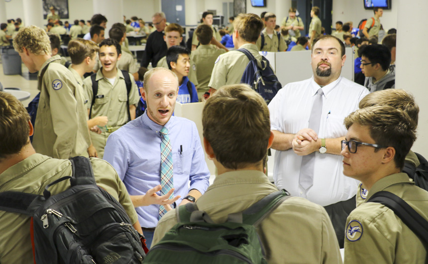 Mr. Steven Nance, who moderates the sailing club, visited Jesuit on Tuesday to meet new Jays at Rush Day. -
