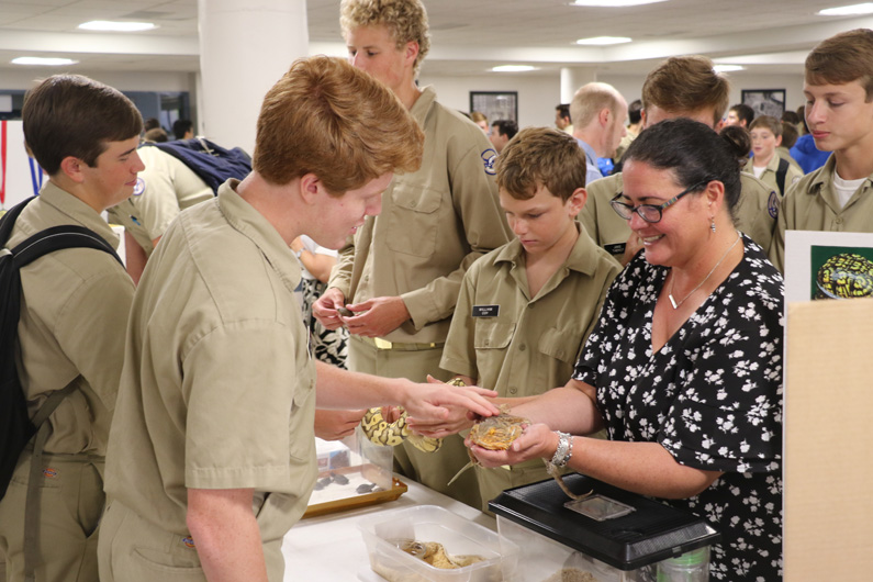 Pre-freshman William Coy and club moderator Mrs. Helen Swan (front) allow students to touch the reptiles on display. Here, Coy handles the ball python and Mrs. Swan lifts the bearded dragon. -
