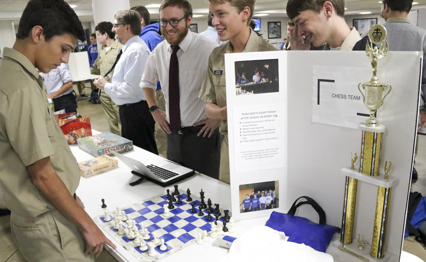 Vincent Granito and Donald Webster initiate a scratch game of chess while Chess Club moderator Mr. Donald Songy '07 stands at the ready to log new members. -