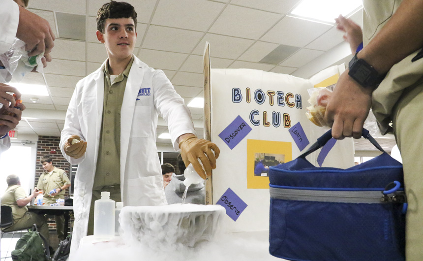 Emory Ducote amazes lunchtime guests at the Biotechnology Club display. -