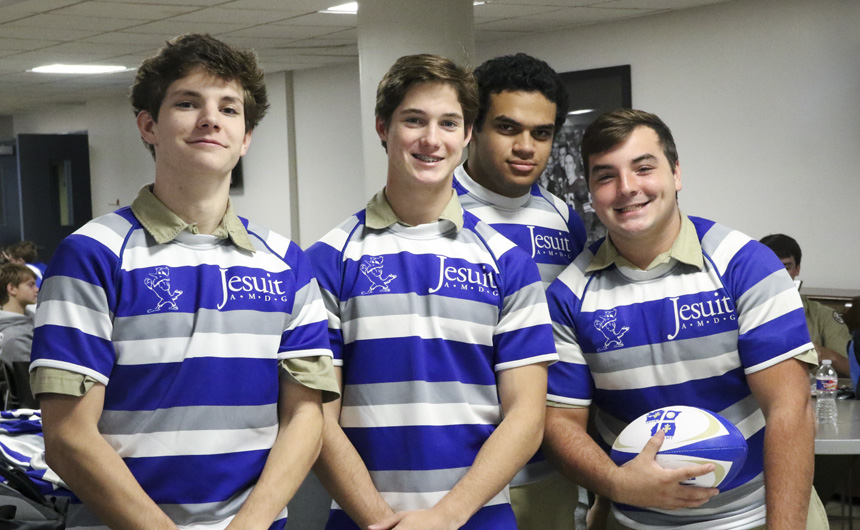 William Newell, Matthew Palmer, Anthony Ceasar, and Zac Beckmann represent the Jesuit Rugby club at Rush Days. -