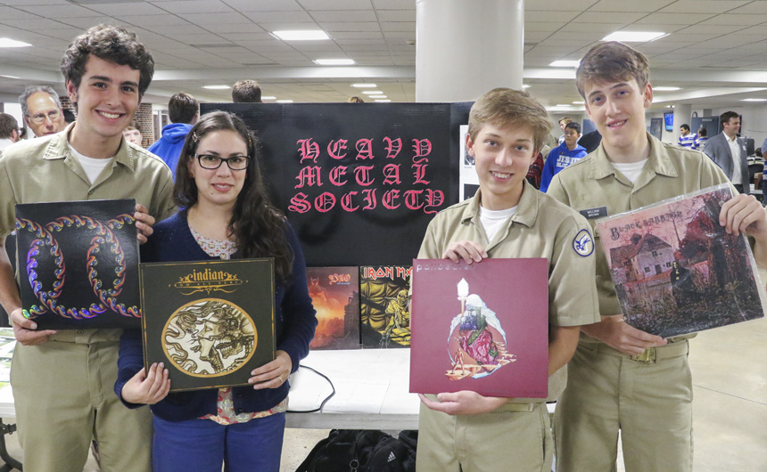 Ethan Ehrhardt, Jackson Abadie, and William Brown join Spanish teacher Mrs. Irma Noyola-Gonzalez in front of the display for the Heavy Metal Society. -