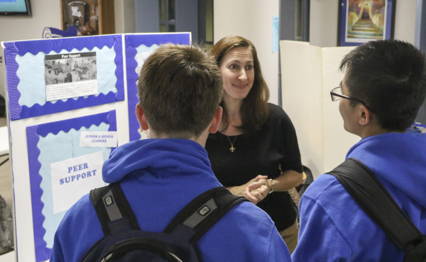 Mrs. Mary Favalora, Jesuits' director of guidance, speaks with a few insterested students about Peer Support. -