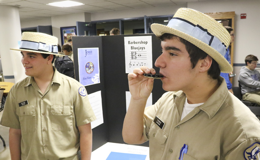 Thomas Sagona finds the right pitch for the Barbershop Blue Jays as Willliam Zelden speaks with interested students. -