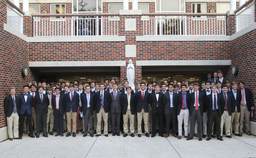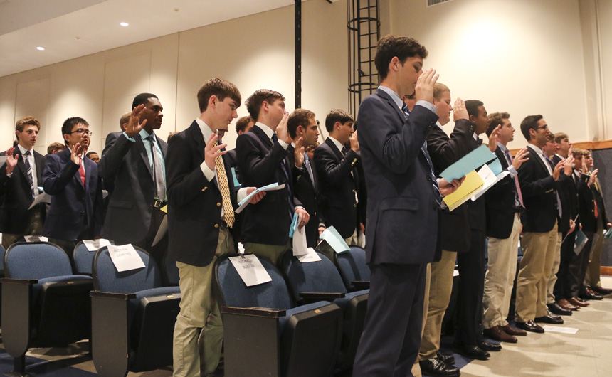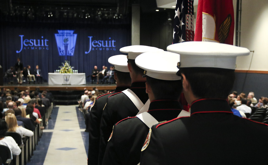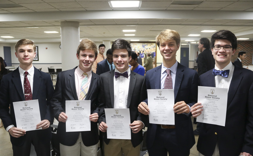 The National Honor Society (NHS) honored 114 Blue Jays as the newest members of the prestigious academic organization on Thursday, Sept. 14, at its annual induction ceremony. The ceremony took place in the Auditorium where 9 seniors and 105 juniors were formally inducted into the St. Aloysius Gonzaga Chapter of the NHS. The evening began with a prayer and the presentation of the colors lead by the MCJROTC Color Guard. Each newly-initiated member received a certificate given by Jesuit President Fr. Christopher Fronk, S.J., and Principal Peter Kernion ’90.