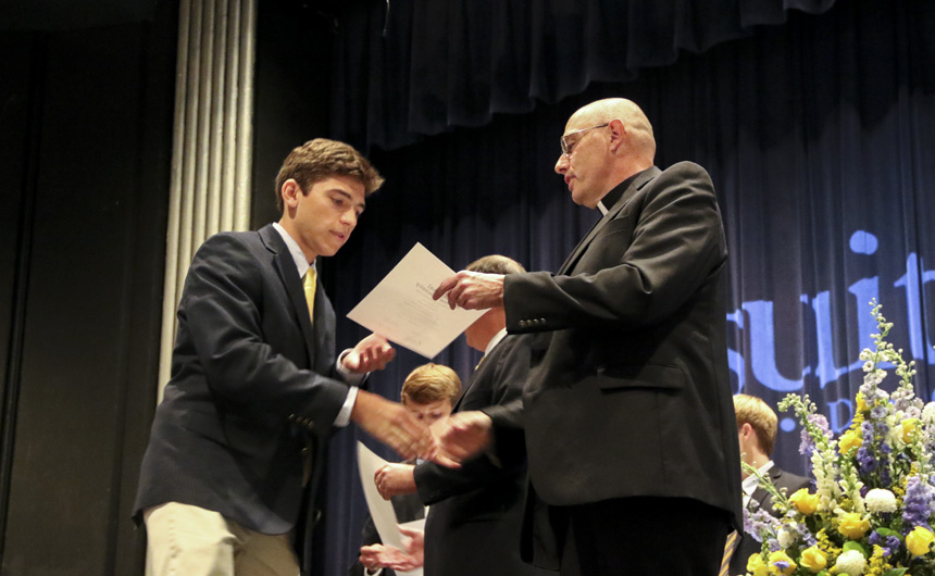Junior Alexander Doll receives his certificate from Fr. Fronk. -