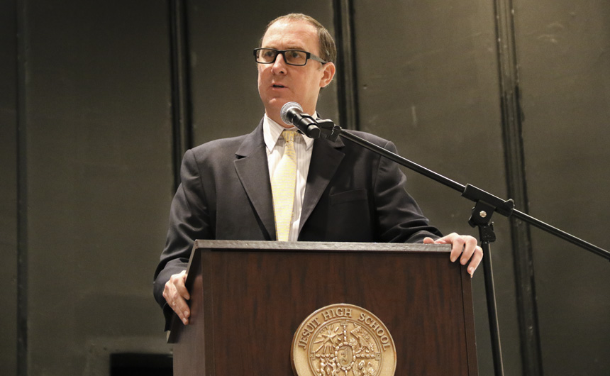 Jesuit principal, Mr. Peter Kernion '90, offers words of welcome to the inductees. -