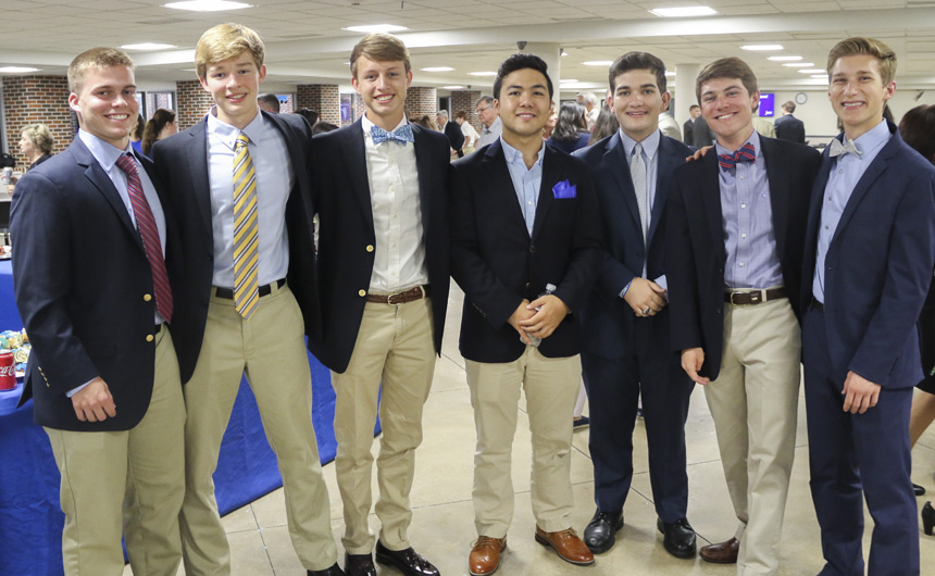 Members of the National Honor Society executvie board are introduced to the assembly – (from left) Chandler Boudreaux, John Thomas Holmes, Greg Buisson, David Hart, Michael Plessala, and Robert Cerise. -