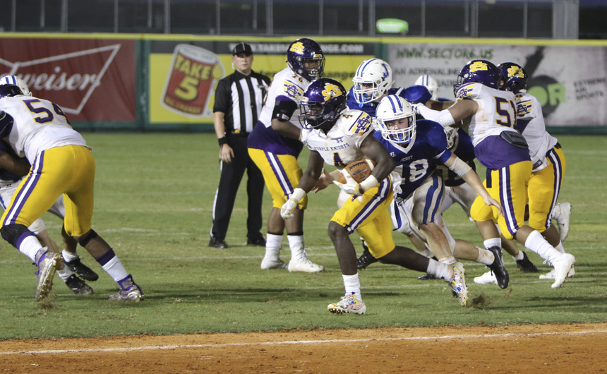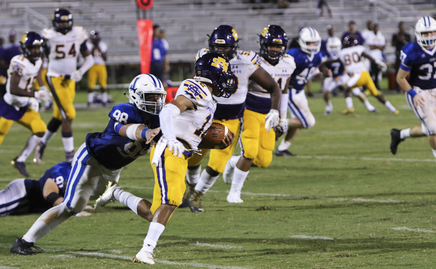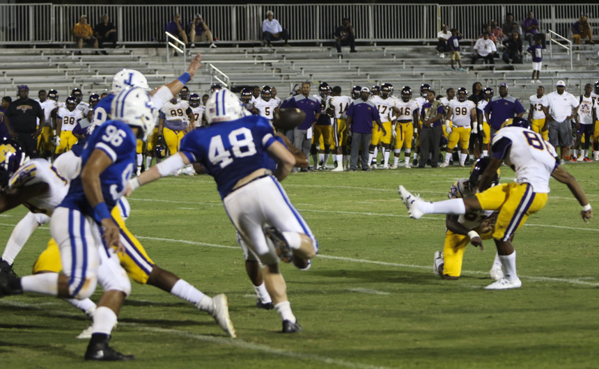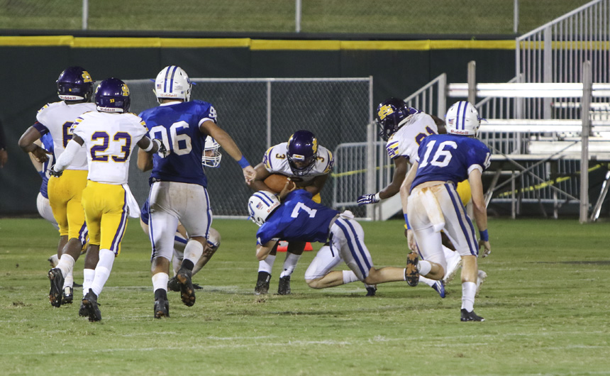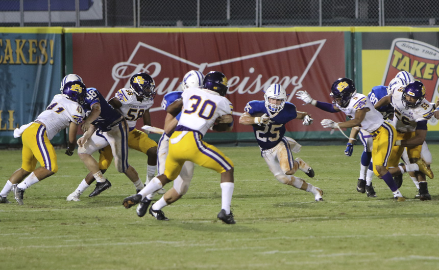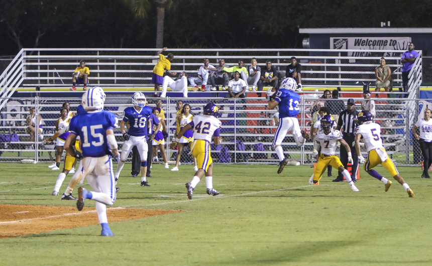 But things started to unravel quickly for the Blue and White. St. Augustine struck back hard, grabbing their first touchdown on an interception and forcing a fumble on the ensuing kickoff. Within minutes the 10-0 lead had turned into a 13-10 deficit.