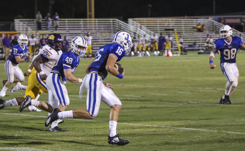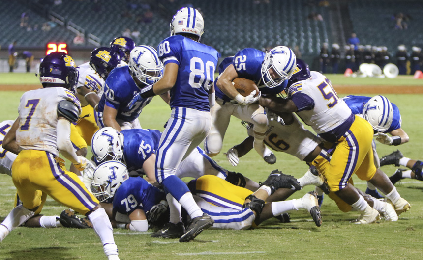 The Jesuit football team falls in the district opener to the Purple Knights of St. Augustine, 37-24.