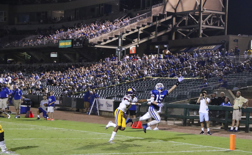 In one of the many third quarter attempts on the end zone, wide receiver Robert McMahon soars after the ball that sailed just over his finger tips. -