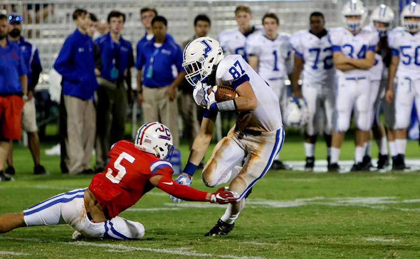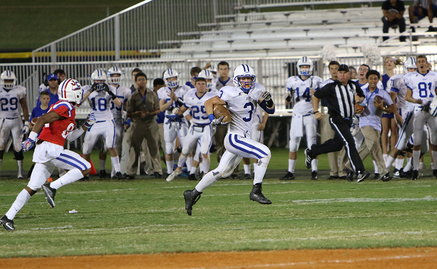 For the second week in a row, a scoreless first half plagued the Blue and White. A five touchdown deficit at halftime is tough for any team to overcome, but especially against the Patriots of John Curtis, who scored 35 unanswered first-half points behind the running game of sophomore quarterback Collin Guggenheim.