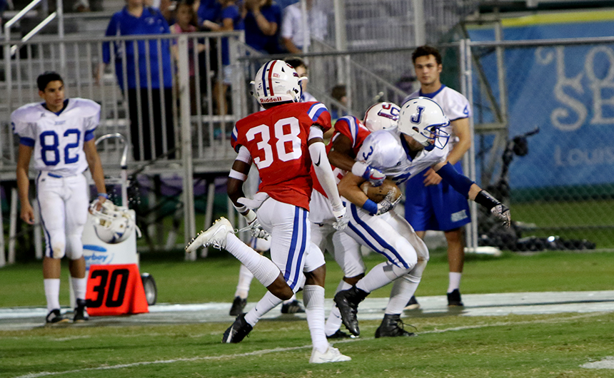 Looking back, the Jays have faced three of the fiercest teams in the district in St. Augustine, Holy Cross, and John Curtis. In fact, all three of these teams to whom the Jays have endured district losses boast undefeated records. The latest installment pitted the Blue Jays against the John Curtis Patriots on Friday night at the Shrine on Airline.
